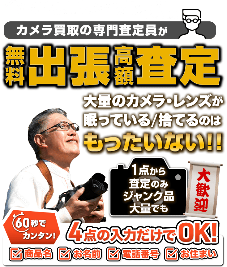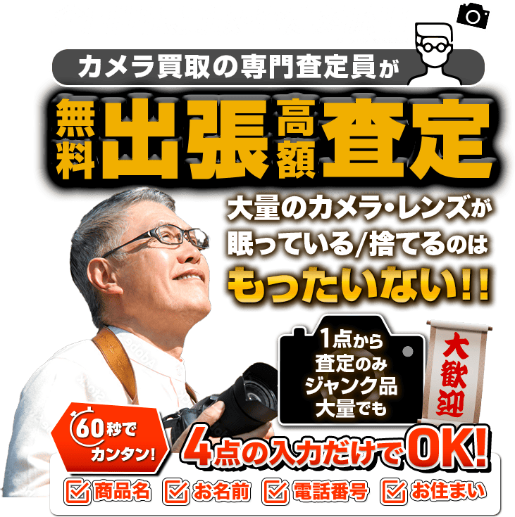 カメラの買取屋さんには買取への「こだわり」があります。カメラの買取屋さんが目指すもの。それは、“どこよりも満足していただける丁寧な査定をし続ける”ことです。どこよりも高額査定を行うのはもちろんのこと、『最短30分の出張査定』『専門店ならではの高額査定』『不良品でも引取可能』『1点から買取OK』 etc...、日々のお客さまとのコミュニケーションを大切にし、ご意見を伺いながらお客様のご要望に最大限にお応えするサービスのご提供に努めております。